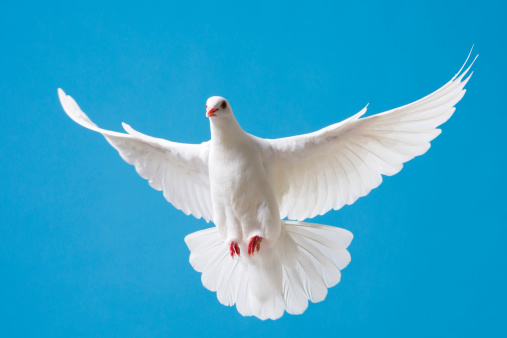 Bueatiful white dove with wings outstretched flying in a clear blue sky